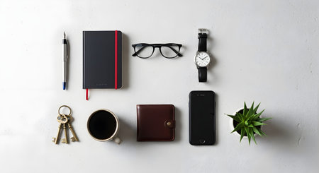 A neatly organized flat lay arrangement of daily essentials on a white textured surface. The composition includes a black notebook, smartphone, wallet, keys, glasses, watch, pen, and a cup of coffee. It represents productivity, minimalism, and a modern professional lifestyle.