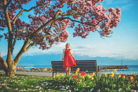 Young blond woman admiring amazing view of Lake Geneva, Switzerland. Woman sitting on the bench under blossom magnolia tree