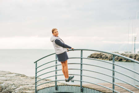 Fashion stylish portrait of pretty preteen girl of 8-9 years old, wearing maroon jumpsuit, posing by the lake