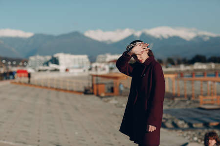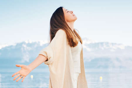 Outdoor portrait of beautiful young woman relaxing by mountain lake, cold weather