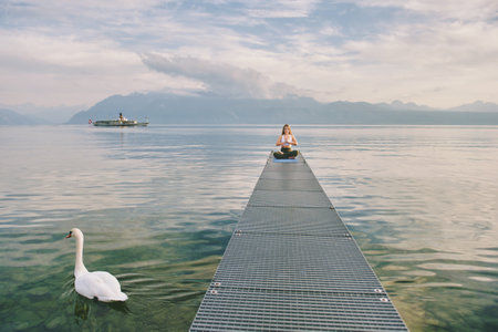 Geneva lake landscape, woman practicing yoga on dock, swan passing by, steam boat floating on background