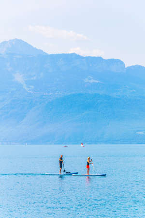 LUTRY, SWITZERLAND, JULY 18, 2017: A couple is paddleboarding on geneva lake near lutry, Switzerland