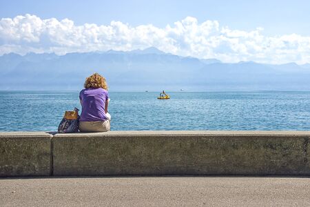 A woman feeding swan with beautiful landscape snow mountains view at lake Geneva, Vevey, Switzerland