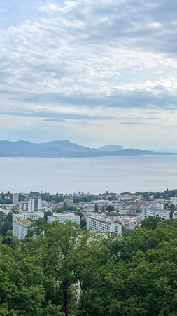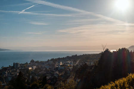 Evening view from the top of the French town Bons-en-Chablais, lake Geneva (lake Leman) and the mountains in Switzerland. Division of Haute-Savoie, region of Auvergne-Rhone-Alpes in France.