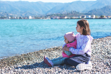 Two sisters sitting on a pebble beach by the sea, embracing each other while gazing at the water. Mountains and a coastal city are visible in the background under a clear blue sky