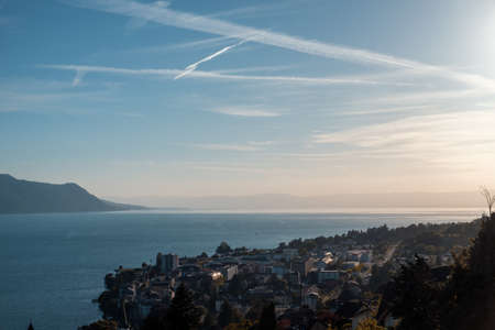 Panoramic view of Lake Geneva, Vevey and the Swiss Alps from Mont Pelerin. Travel and tourism concept.