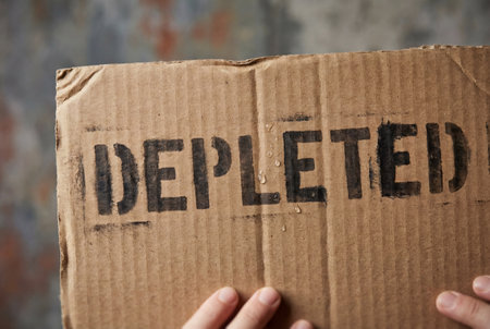 A pair of hands holds a rough brown cardboard sign featuring the word depleted stenciled in black ink with water droplets on the surface against a blurred gray background.