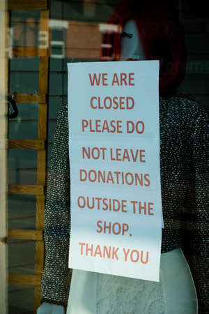 Sandhurst, United Kingdom, 9th April 2020:- A sign outside a charity shop after it has closed asking not to leave donations outside due to the Covid-19 outbreak