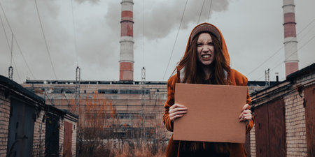 One woman holds a cardboard poster in her hands against standing background of the factory. Activist in orange hoodie during a picket with placard at the plant. Concept of environmental pollution.