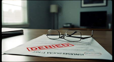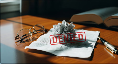 Close up of a hand holding a piece of paper with the word DENIED on it