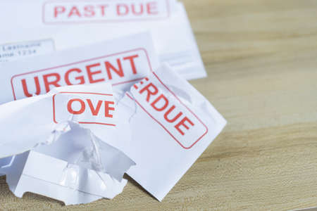 Debt letters that are collected on past overdue bills and final announcements on the table. Red writing to represent the struggle against economic unemployment.