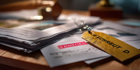 Exhausted stamped document with evidence tag on wooden table in warm light, close up macro shot showing paper details