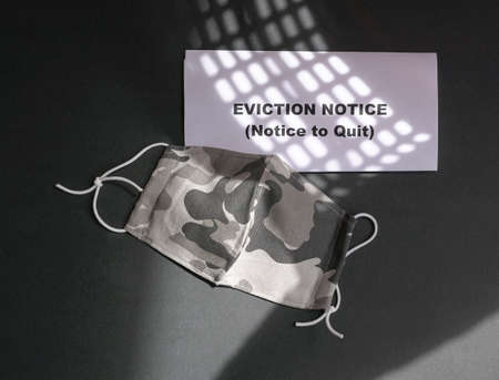 Defaulting renter with facemask receives letter giving notice of eviction from home on wooden table