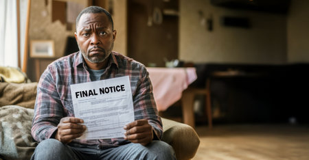 A middle-aged man sits on a worn couch, holding a final notice bill. His worried expression reflects the emotional burden of overdue payments in a cluttered, dimly lit living room.