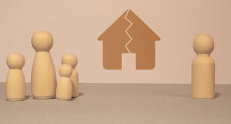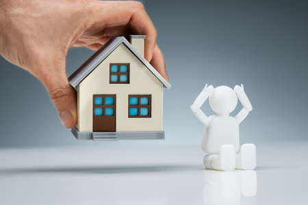 Close-up Of A Person's Hand Taking Away House Model Near Stressed Human Figure