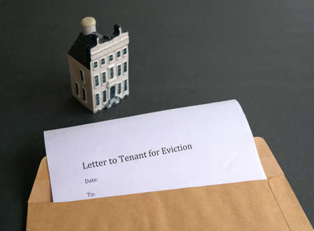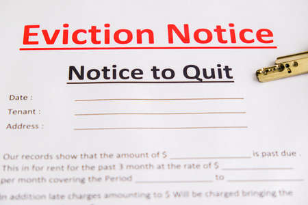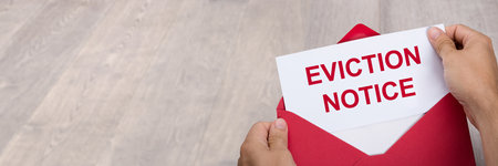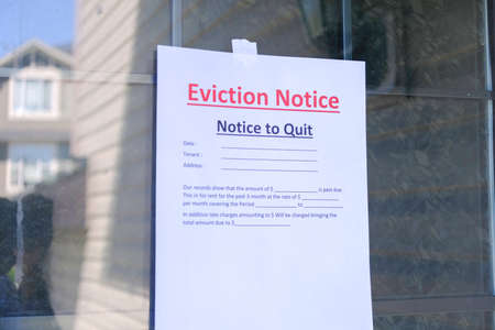 document with the text eviction notice, Civil servant sticks a notice of eviction of the tenants hangs on the door of the house, debt, property, loan, agent, bankruptcy, dispossess, problem