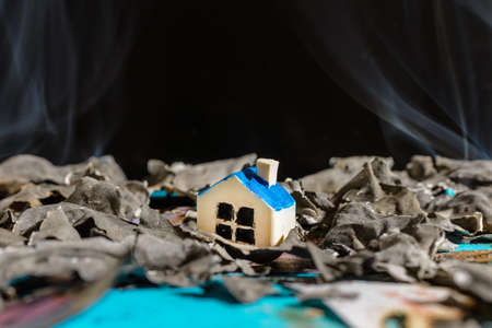 Miniature toy house stand on burnt money Euro bill banknotes.close up.Blurred long exposure background and foreground.Indoors shot.