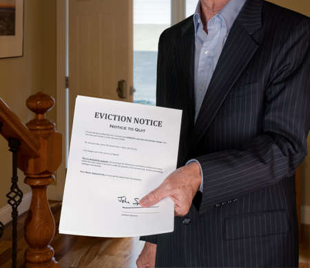 House Landlord or lawyer in suit showing eviction notice on isolated background.