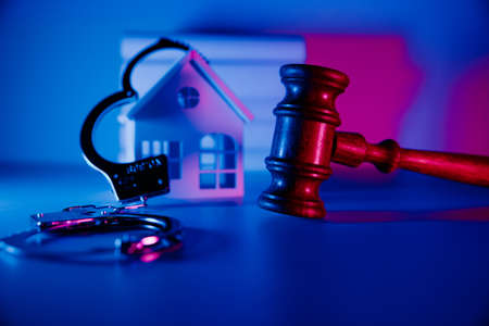 Wooden gavel of the judge handcuffs and the house. Concept fraud with real estate