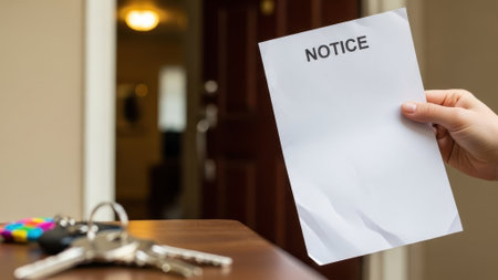 A hand holds a blank notice document with the word NOTICE printed at the top, placed near a set of keys on a wooden surface, suggesting important information or a pending event