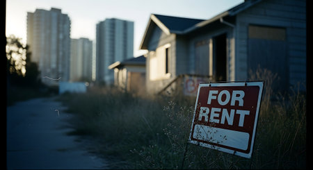 hand holding mortgage or rent sign in front of backyard and home exterior bokeh, concept of real estate affordability and property market