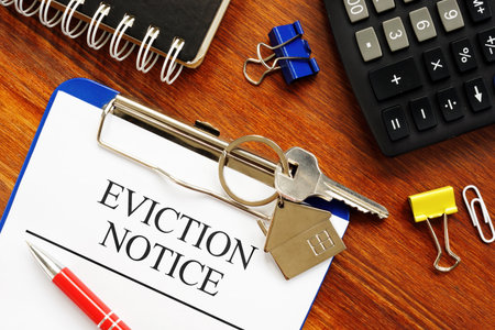 Eviction notice placed on wooden desk in living space setting. Soft focus background provides context of the surrounding environment