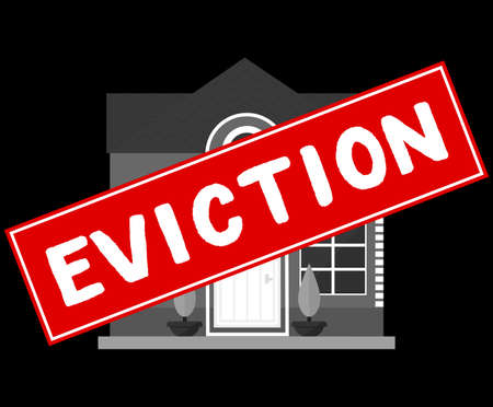 House with foreclosure red label Eviction. Homes being repossessed by the bank. Vector illustration. On black background