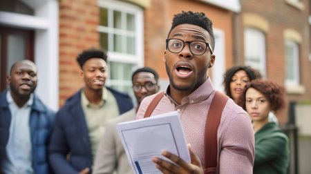Photo of shocked dark skinned young man has surprised expression carries papers with graphics his notes stupefied to notice many people on meeting preapres for conversati : Generative AI