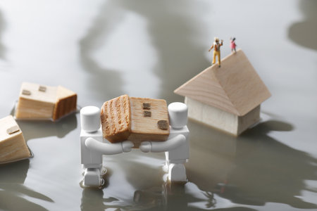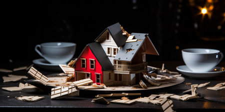 House model and broken dishes on black table depicting destruction after earthquake. Space for text : Generative AI