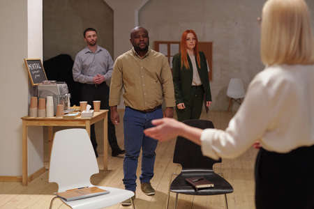 Three young intercultural groupmates in casualwear moving towards blond female counsellor