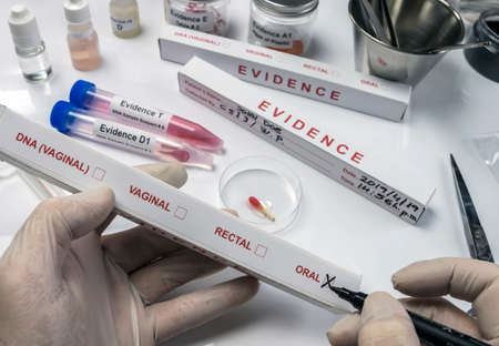 Specialized criminal police check box for oral DNA evidence in an evidence box, concept image