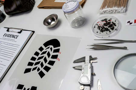 Forensic lab, shoe prints examined as evidence of murder victim, conceptual image