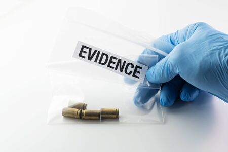 Closeup of forensic scientist's hand in blue rubber glove holding evidence bag with 9 mm bullet cases. Crime, forensic science, investigation and violence concepts.