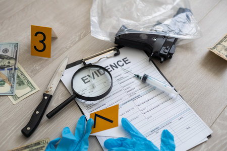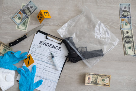 Police record along with some forensic evidence of murder at Laboratory forensic equipment, conceptual image