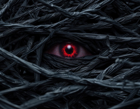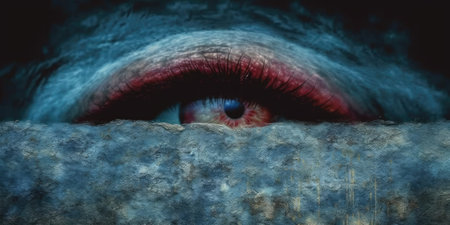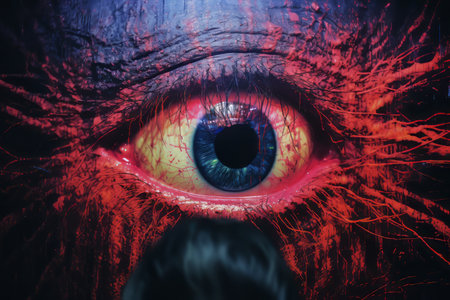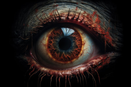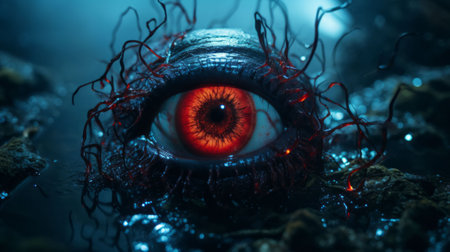 a woman's red eye captured in a detailed science fiction illustration, resembling the style of cryengine. this ultra-high-definition image showcases the realistic attention to detail, with dramatic lighting reminiscent of national geographic photos. the artwork portrays an apocalyptic scene, creating a captivating piece of apocalypse art. ai generated