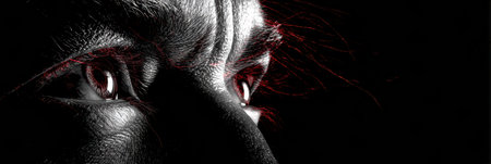 Eyes show visible red veins on a quiet black background with the right side appearing clear, creating a striking contrast and intense focus on the gaze.