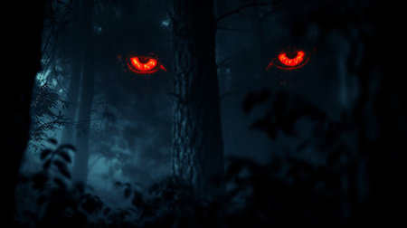 Mysterious glowing eyes in dark forest at night