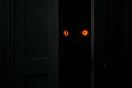 A pair of vibrant orange, glowing eyes stare out from the deep darkness behind a slightly open door, creating a chilling and mysterious atmosphere. This eerie image evokes suspense, horror, and the presence of something hidden and watchful, perfect for Halloween, fright, or supernatural themes.