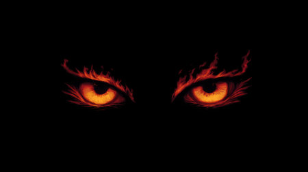 This digital illustration presents a close-up of two bright orange eyes against a deep black backdrop. The artwork features textured details and an expressive style, possibly achieved through digital painting. The composition evokes a sense of mystery and drama, suitable for various editorial and commercial applications. The contrasting colors create a visually striking image.