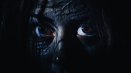 Close-up image of a woman with red eyes in the dark