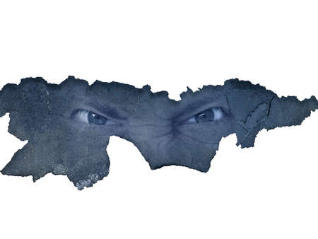 red eye of man looking through the hole in the dark