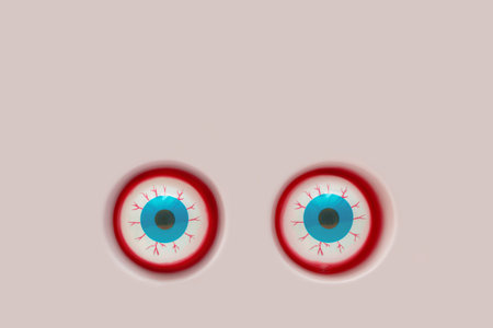Scary Halloween layout made with creepy, bloody floating witch’s eyeballs in the holes with blood, on isolated beige background. Halloween party shocking concept. Minimal flat lay.