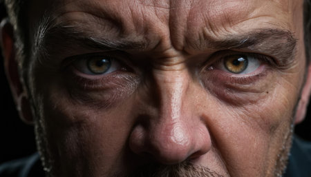 Close-up of a frowning man with intense blue eyes expressing anger and frustration. Ai generated