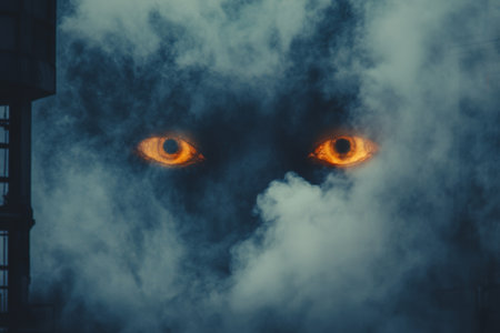 Eerie industrial smoke shaping eyes against a dark background in stunning photorealistic style