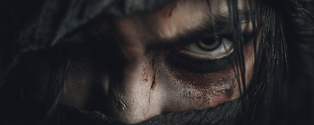 Mysterious eyes peering out from behind dark fabric