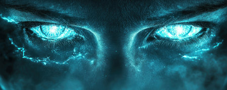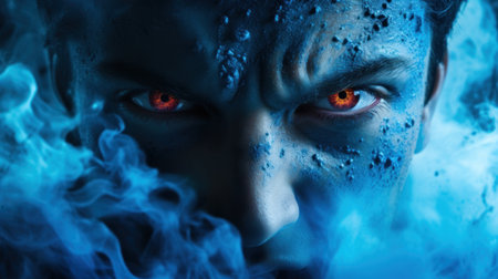 A close up of a man with red eyes and blue smoke, AI