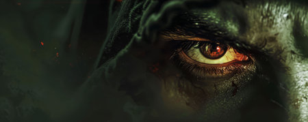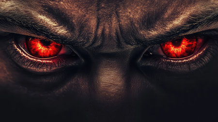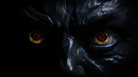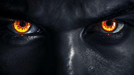 Close-up of intense amber-colored eyes on a black male face. Concept of intense stare, power, horror, Halloween.