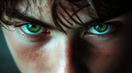 A captivating close-up featuring intense green eyes that convey deep emotion. The natural lighting highlights facial features and enhances the overall beauty of the portrait.