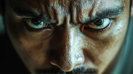 A close-up shot of a man showing intense emotions through his piercing eyes and furrowed brow