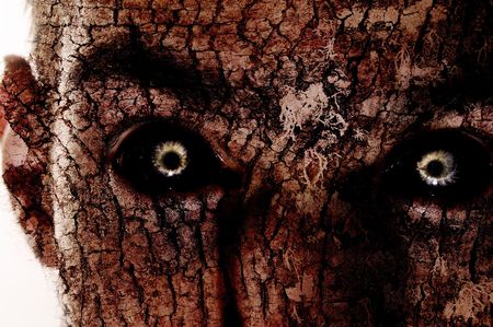 Human face is merging with tree bark texture in surreal digital flat design, glowing amber eyes. Fantasy, nature, artistic, mystical, organic, abstract, ethereal